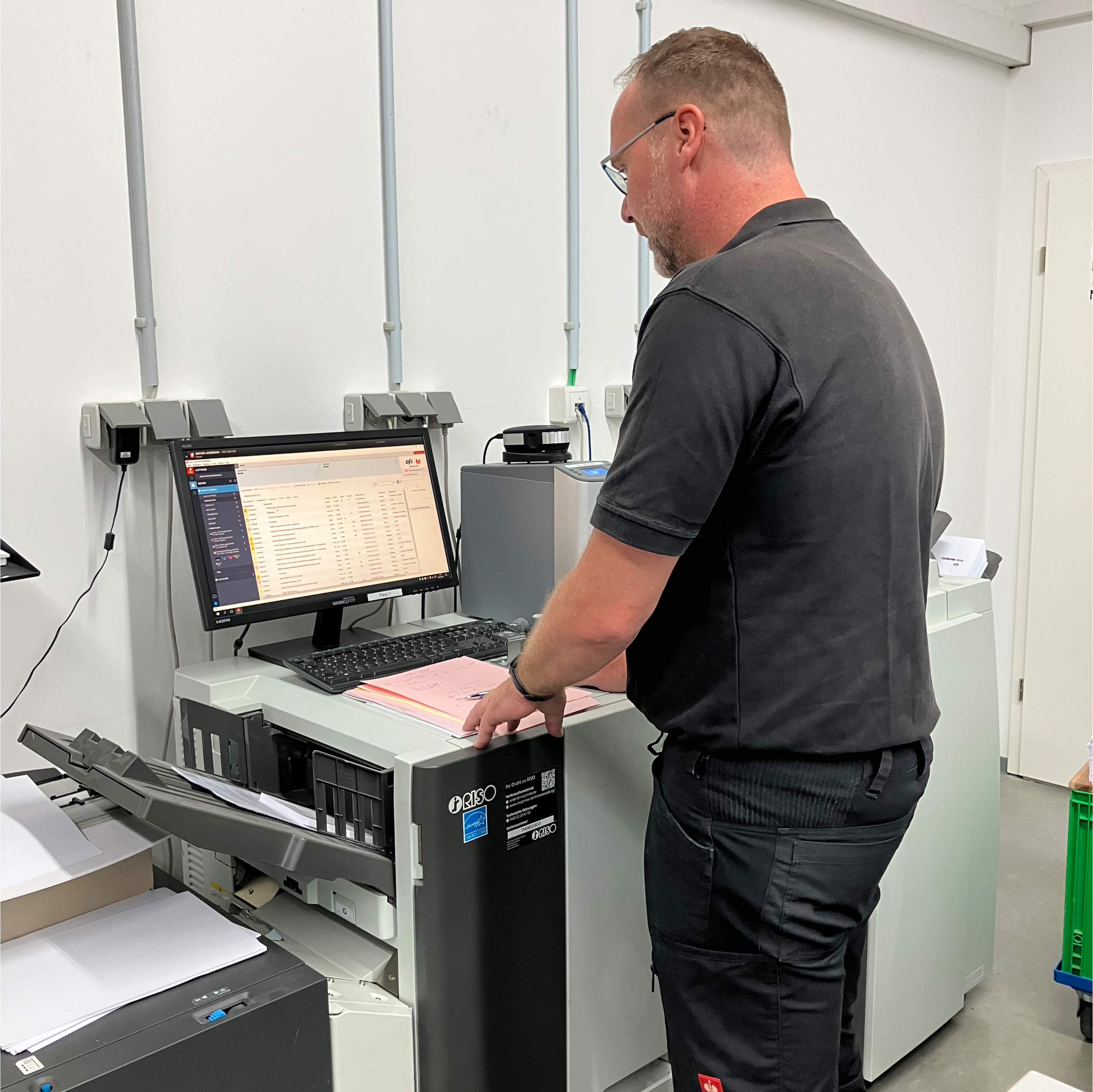 Angesichts wachsender Mengen an einfarbigen Bedienungsanleitungen und steigender Kosten im Tonerdruck suchte die Druckerei nach einer wirtschaftlichen Alternative. Bei Recherchen und Messebesuchen stieß Inhaber Stefan Zimmer wiederholt auf RISO und wurde neugierig. „Je mehr ich mich mit RISO beschäftigt habe, desto klarer wurde: Das könnte genau die Lösung sein, die wir brauchen.“